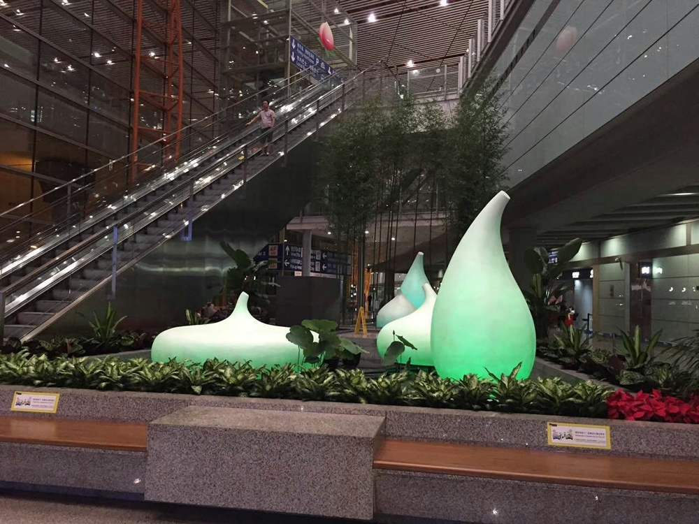 T3C二層進港東西兩側各有一處清新舒適且現(xiàn)代美觀的“小綠洲”景觀。由“水滴”提煉出來的造型,現(xiàn)代而簡約,形態(tài)優(yōu)美,象征著清新自然、生生不息的美好寓意。東邊名為《曲苑風荷》,以水滴造型設計的小品配合流水,通過燈光和色彩的處理,使小品如同身姿曼妙的舞者,美輪美奐。西邊名為《高山流水》,以秀竹為背景,將小品和流水形象地表現(xiàn)為潺潺流水和巍巍高山相映成趣的意境,仿佛山巒起伏的遠景就呈現(xiàn)在面前。