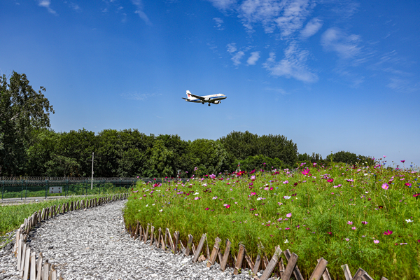 首都機(jī)場西跑道北端由北部土坡區(qū)、南部平整區(qū)以及排水明溝等區(qū)域構(gòu)成,總面積約3.3萬平方米。該區(qū)域原為渣土堆,堆放了較多建筑垃圾,容易吸引鳥類停留,環(huán)境治理難度較大。面臨種種挑戰(zhàn),首都機(jī)場飛行區(qū)管理部積極創(chuàng)新工作思路,以人工種植的草坪為基底,選擇4種—5種適合北方地區(qū)生長且不吸引鳥類的草種整體分區(qū)種植,并搭配種植小面積波斯菊,在西跑道北端打造了一片花海。
