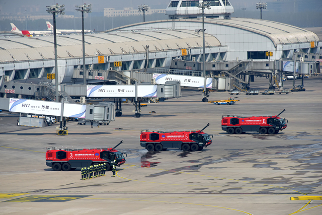 壯觀絢麗的三道水門看似并不復(fù)雜,卻絕非“大力出奇跡”的簡(jiǎn)單操作。參保人員先后數(shù)十次利用747實(shí)體訓(xùn)練飛機(jī)開展訓(xùn)練,從車輛點(diǎn)位確定到射水時(shí)間把控,從依據(jù)風(fēng)向調(diào)整水炮方向到兩車進(jìn)行水流對(duì)接,每一個(gè)細(xì)節(jié)都需要反復(fù)琢磨。同時(shí),為使水門能夠保持較長(zhǎng)的時(shí)間,保障組人員精密測(cè)算,確定了現(xiàn)場(chǎng)車輛距離條件下形成水門的最小射流,既能保證水門的完美形態(tài),又能將時(shí)間控制地精準(zhǔn)。