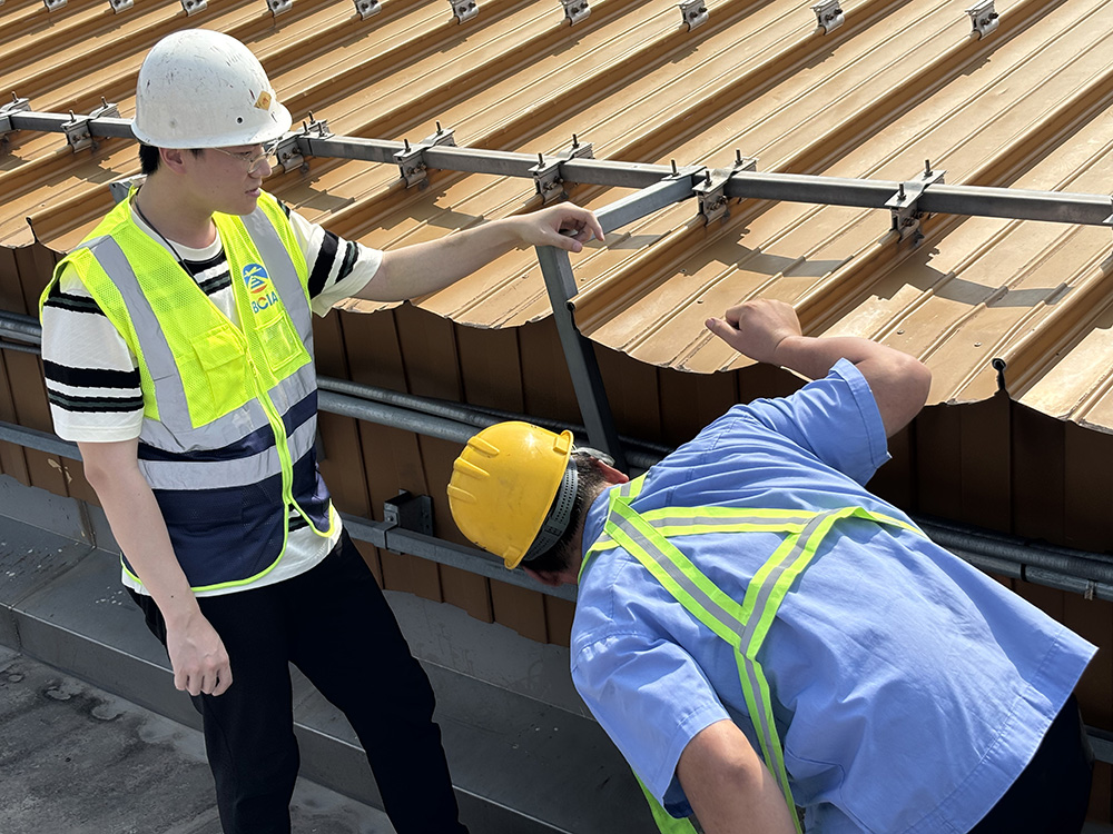 7月12日,在3號航站樓屋面溫度突破50攝氏度的極端時段,丁博嚴來到作業(yè)現(xiàn)場。他注意到天氣預(yù)報顯示午后可能有短時強風(fēng)和降雨,特意趕來檢查新更換天窗采光板的固定情況。“在剛開始更換天窗采光板時,發(fā)現(xiàn)尺寸與舊結(jié)構(gòu)不匹配,及時返工才避免了漏雨。咱們在工程上必須小心謹慎,才能避免今后雨季的隱患”。他很少說教,但工人們都記得他那句樸實的話:“現(xiàn)在多流一滴汗,雨季就少修一個漏?!痹谶@個滾燙的夏天,這個離天空最近的“戰(zhàn)場”記錄著比溫度更高的熱情。