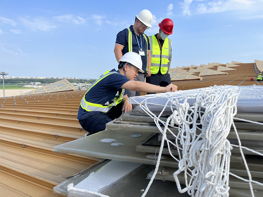 “透過屋頂?shù)牟AВ夷芸吹綐莾?nèi)旅客來來往往,享受著空調(diào)的清涼,但他們并不知曉這場(chǎng)屋頂上的‘戰(zhàn)斗’?!表n峰笑著說。而這份“不知情”正是韓峰和項(xiàng)目團(tuán)隊(duì)追求的最高褒獎(jiǎng)。在項(xiàng)目團(tuán)隊(duì)的嚴(yán)格把控和高效組織下,一塊塊嶄新的高強(qiáng)度采光板精準(zhǔn)就位,守護(hù)著每一位旅客頭頂上方無風(fēng)無雨的晴空。