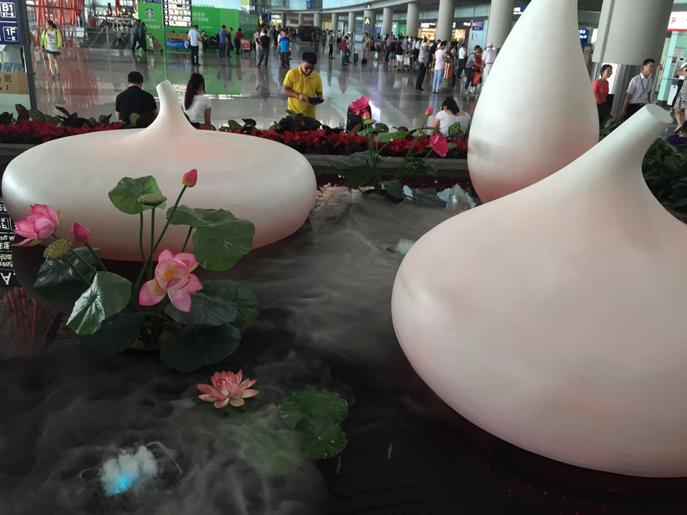 T3C二層進港東西兩側各有一處清新舒適且現(xiàn)代美觀的“小綠洲”景觀。由“水滴”提煉出來的造型,現(xiàn)代而簡約,形態(tài)優(yōu)美,象征著清新自然、生生不息的美好寓意。東邊名為《曲苑風荷》,以水滴造型設計的小品配合流水,通過燈光和色彩的處理,使小品如同身姿曼妙的舞者,美輪美奐。西邊名為《高山流水》,以秀竹為背景,將小品和流水形象地表現(xiàn)為潺潺流水和巍巍高山相映成趣的意境,仿佛山巒起伏的遠景就呈現(xiàn)在面前。