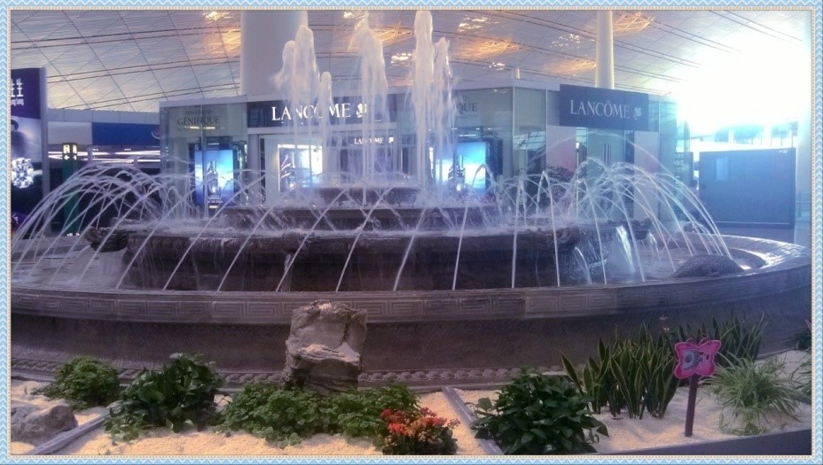 T3E免稅區(qū)的中央景觀設計了《御泉垂虹》噴泉。它的造型借鑒了萬園之園的圓明園“大水法”,它豐富多彩的噴水形式和色彩把航站樓2公里的軸線裝點得色彩斑斕。在水池的東(青龍)、南(朱雀)、西(白虎)、北(玄武)有四個震水獸,保四方風調(diào)雨順、九洲平安。