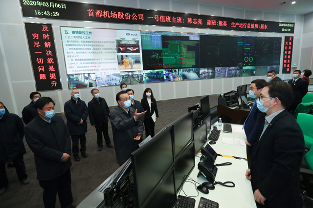 在機(jī)場(chǎng)運(yùn)行控制中心,李克強(qiáng)聽(tīng)取疫情發(fā)生以來(lái)全國(guó)航班運(yùn)行、人員出入境、貨物進(jìn)出港等情況匯報(bào),對(duì)民航系統(tǒng)保障醫(yī)務(wù)人員和抗疫物資運(yùn)輸、開(kāi)通點(diǎn)對(duì)點(diǎn)航班幫助重點(diǎn)行業(yè)農(nóng)民工返崗復(fù)工表示贊許。